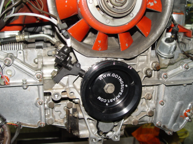 Aluminum 158 mm pulley, distributor plug, sensor mount. (1986 3.2 Carrera motor on stand)
